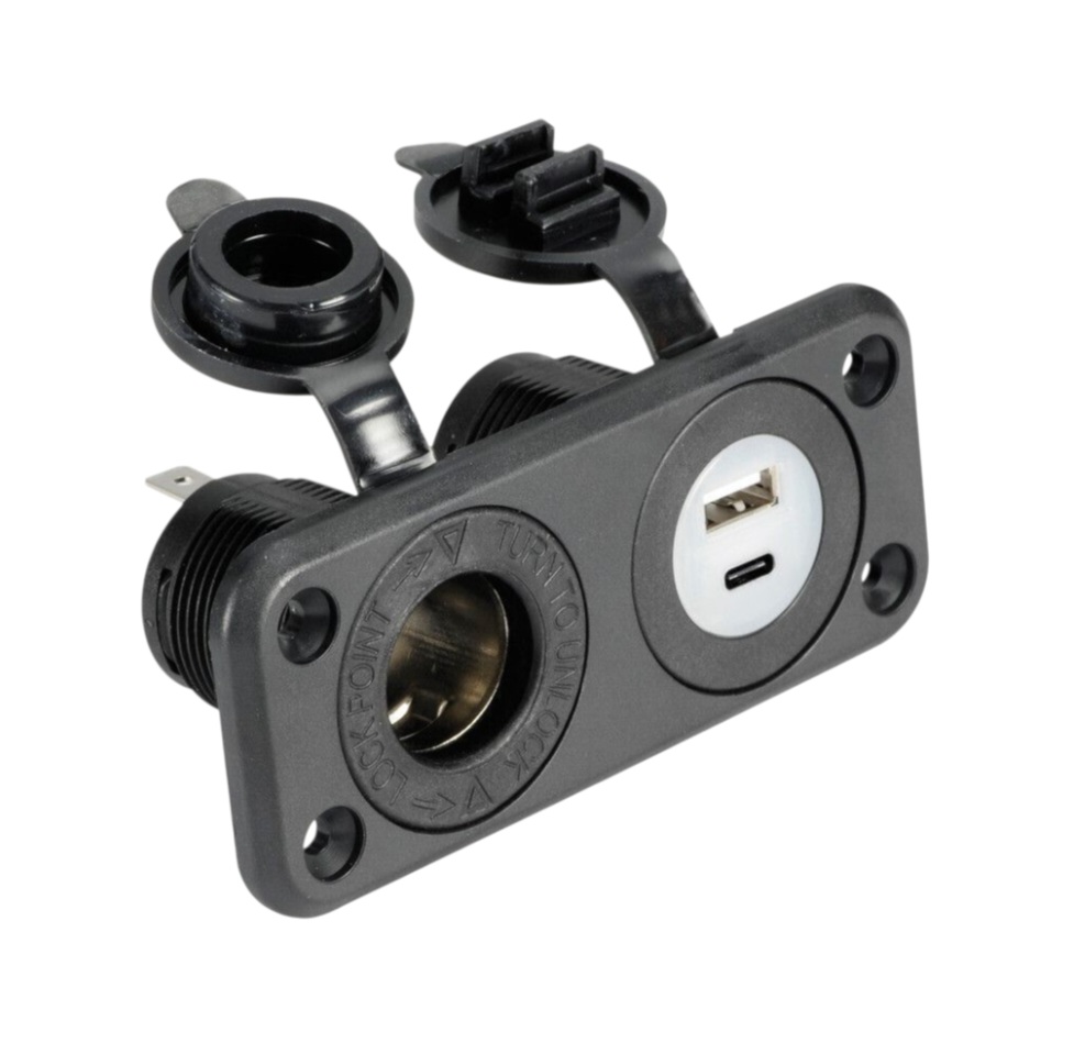 La prise double USB-A + USB-C noire encastrable (4,8A), avec sortie allume-cigare et étanchéité garantie, est compatible 12V/24V. Parfaite pour divers appareils, elle offre une solution pratique et fiable pour une utilisation polyvalente.