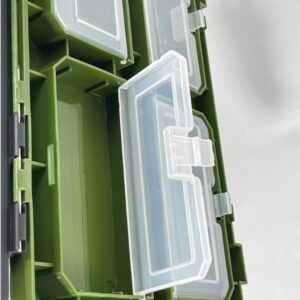 - Plusieurs compartiments internes aménagés pour divers petits accessoires (hameçons, plombs, etc.)