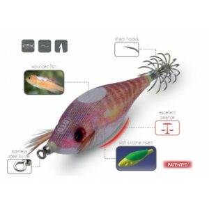 Leurre de calmar de DTD, conçu pour ressembler à un poisson blessé en ayant une marque blanche sur le dos comme les vrais poissons blessés.